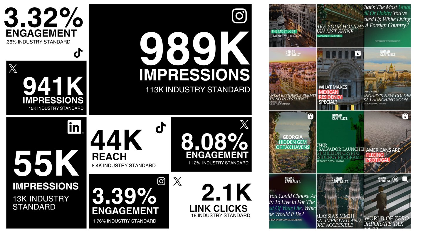 Nomad Capitalist's social media presence was elevated with a refined brand aesthetic, adaptive short-form strategies, and community-driven content. The result: a feed that feels like a magazine, performs like a growth engine, and positions them as both experts and humans in their space.